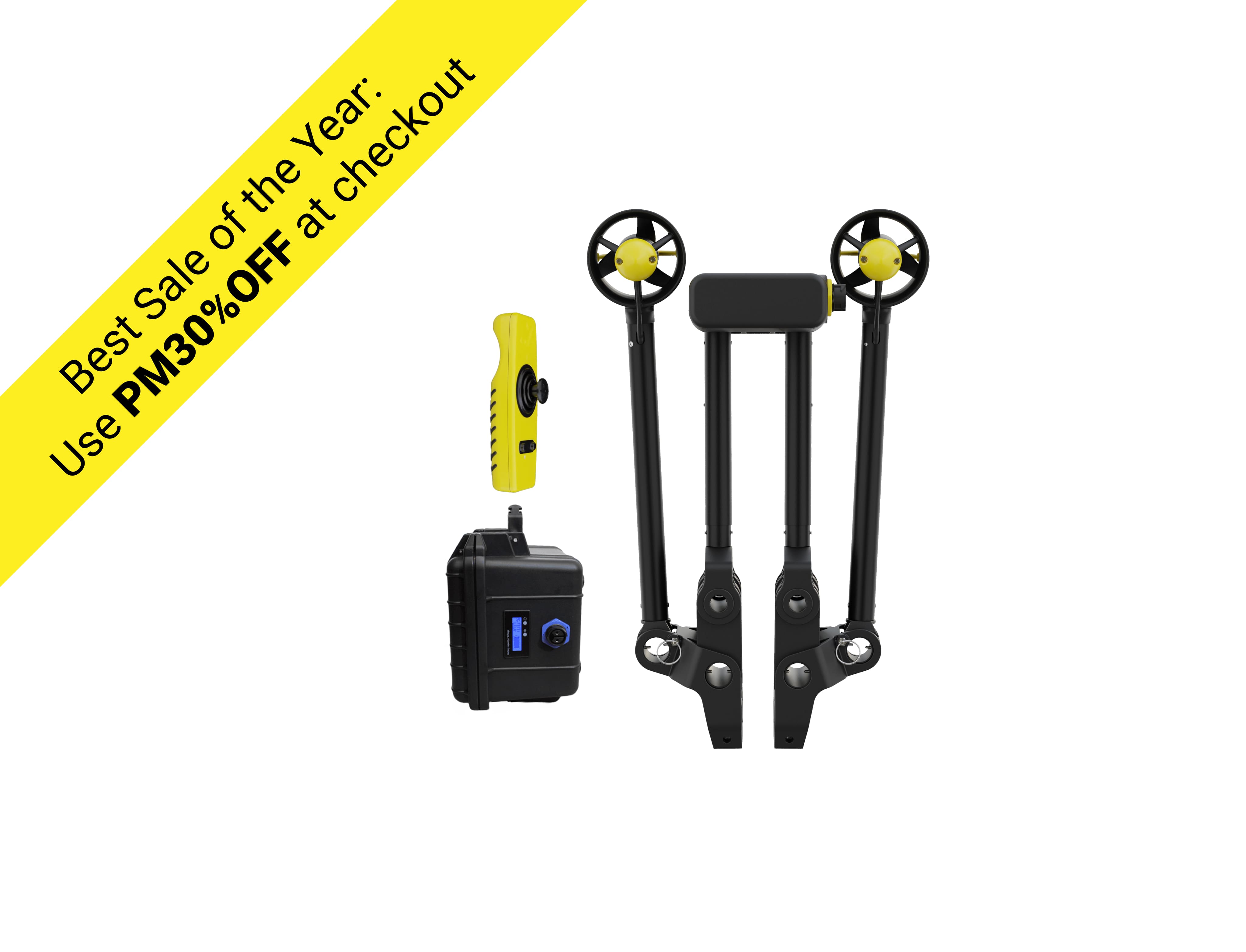 The first and only dual trolling motor on the market. It's a joystick-controlled system for effortless kayaking in fresh and salt water.