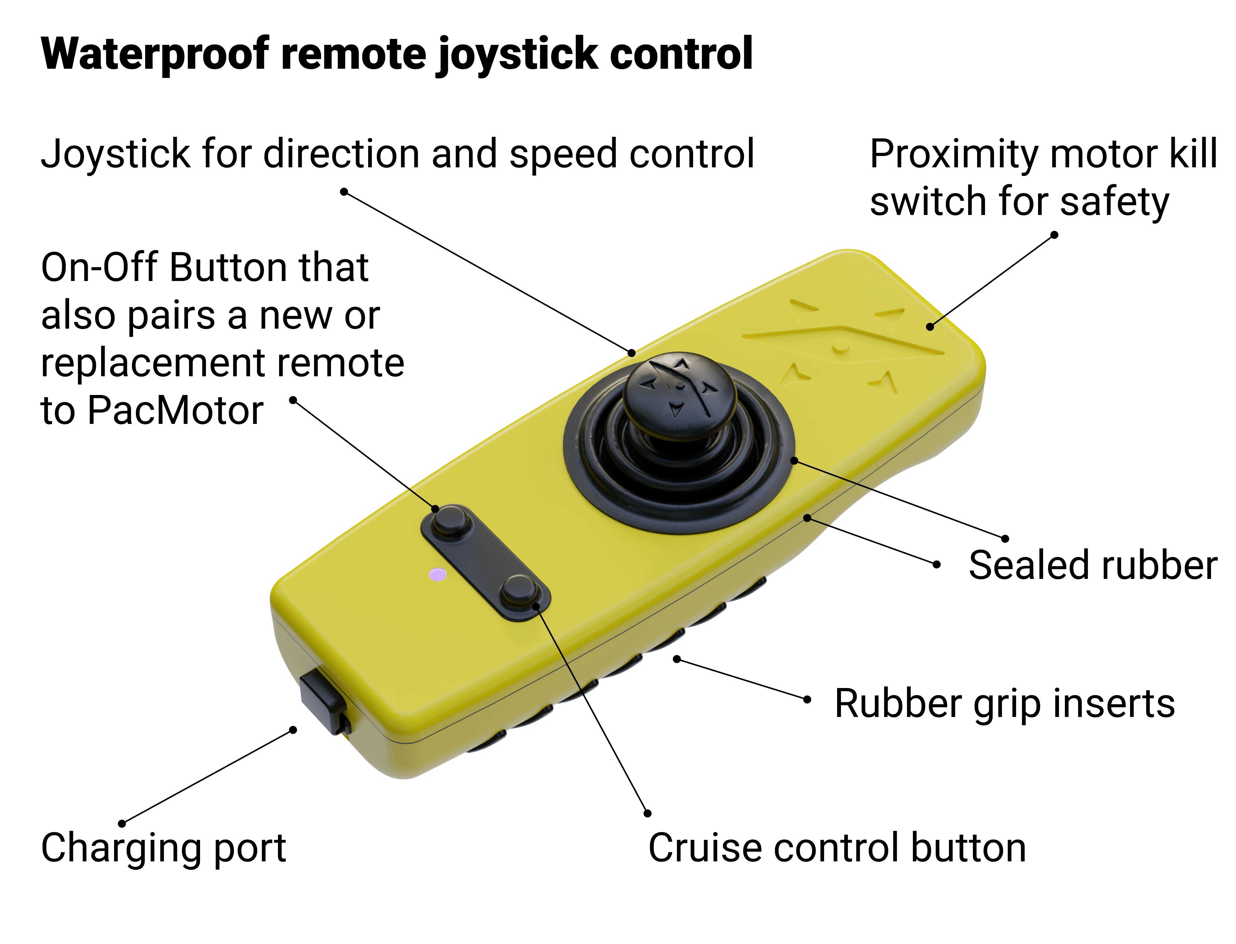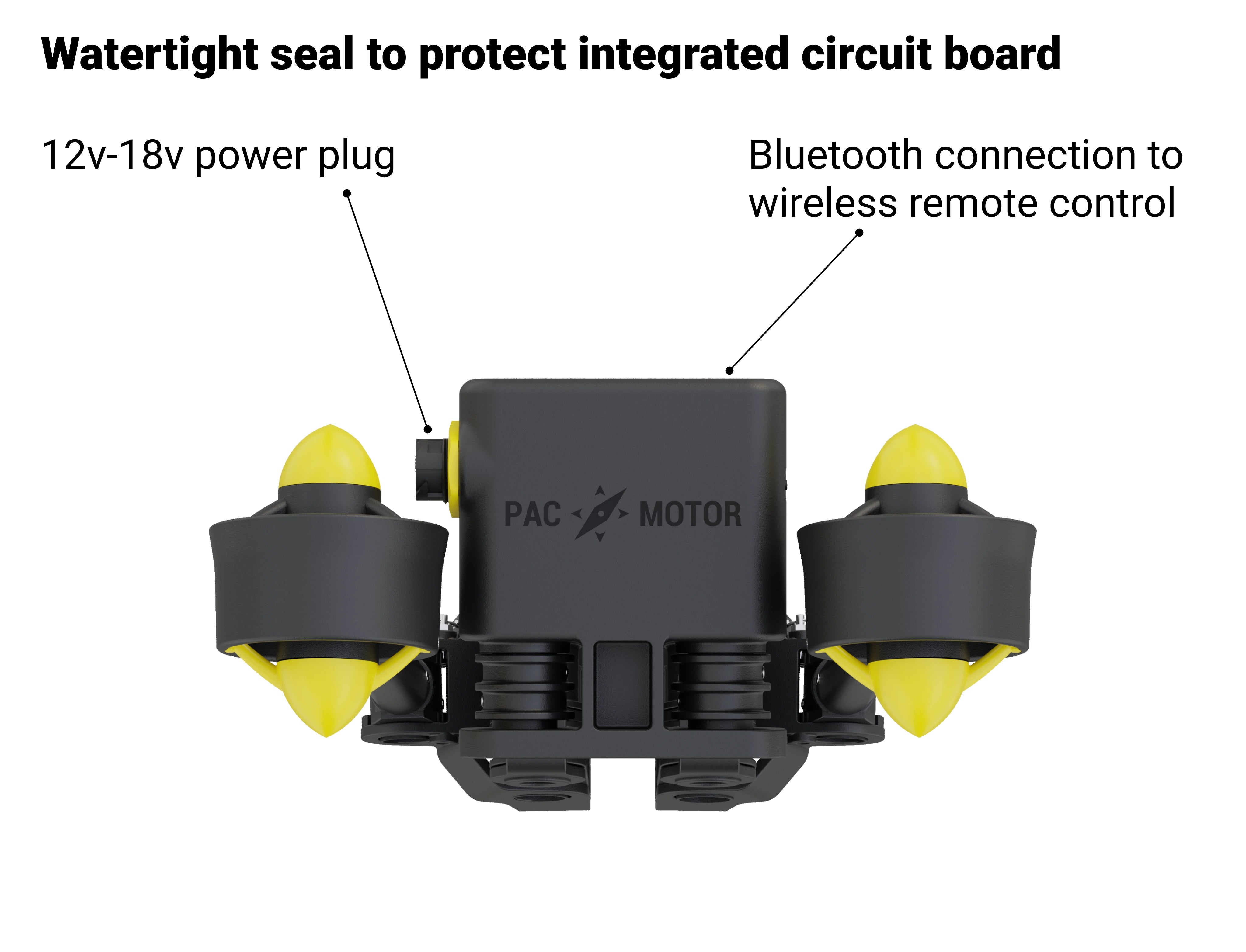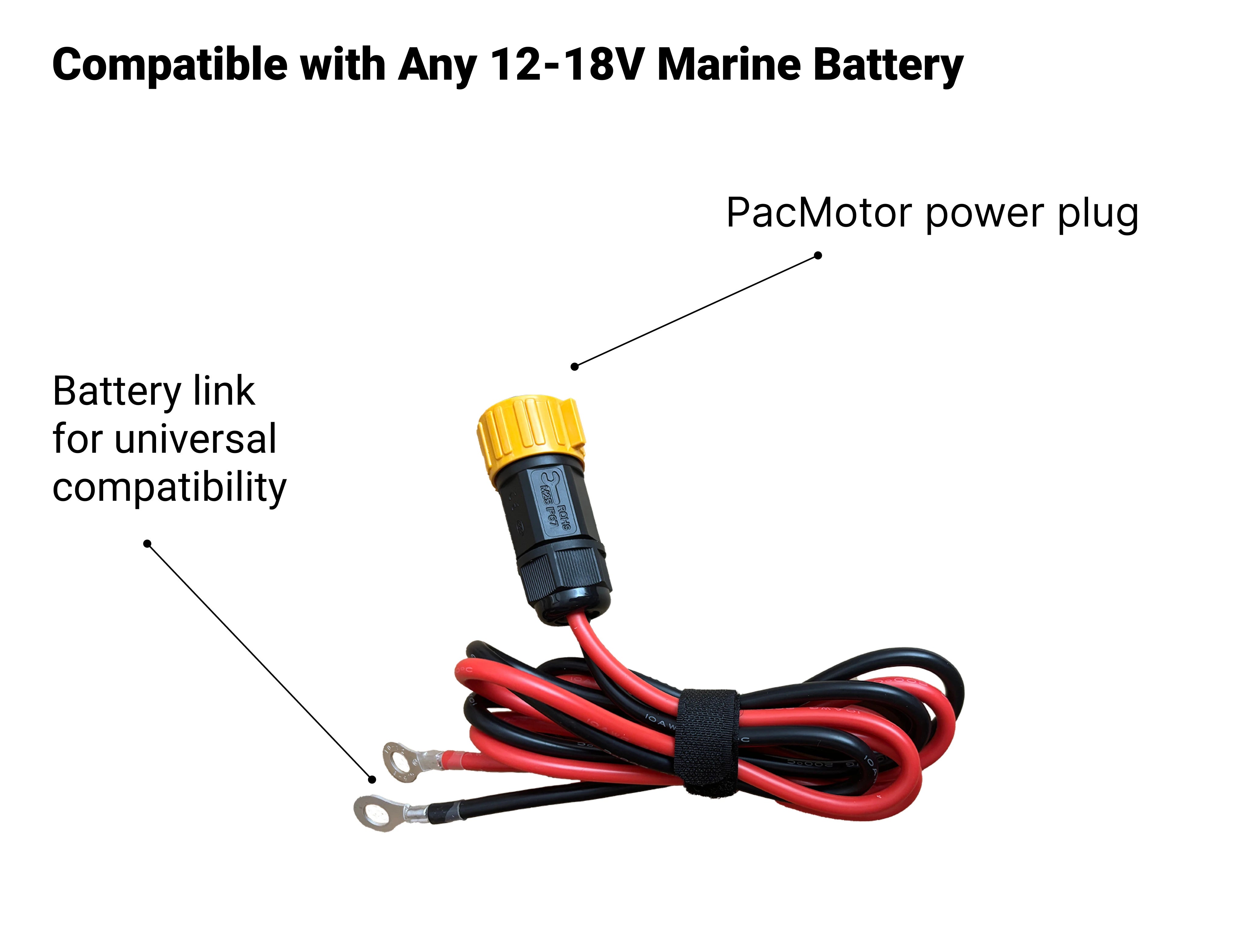 This includes everything you need to get trolling on your kayak, paddleboard, or canoe. The only thing not included is the battery, but you can use any 12V battery to power your PacMotor. Most people use a Lifepo4 battery; we recommend a 50AH battery.